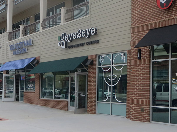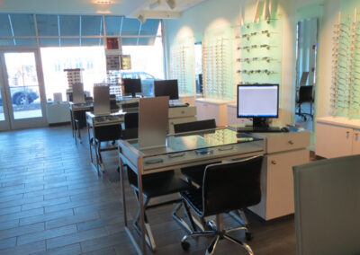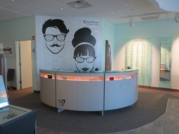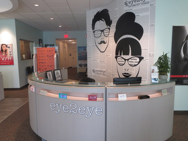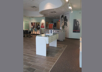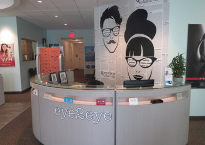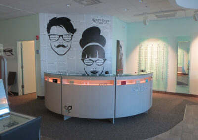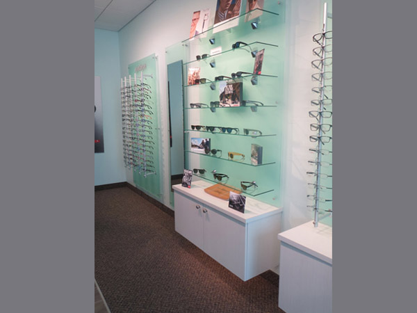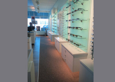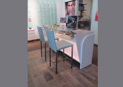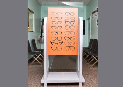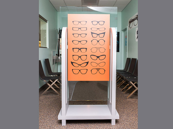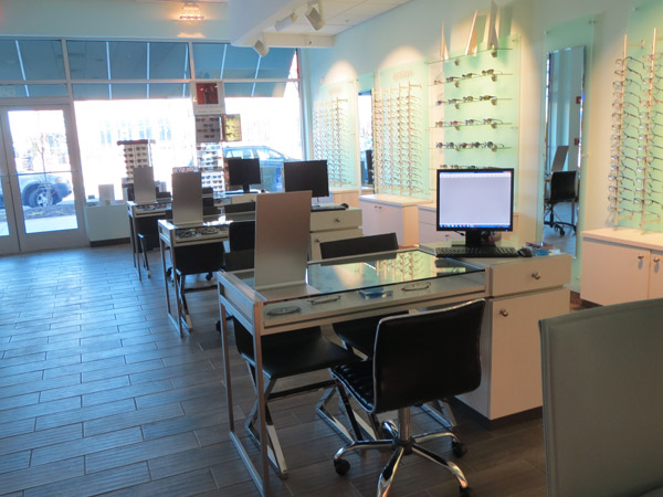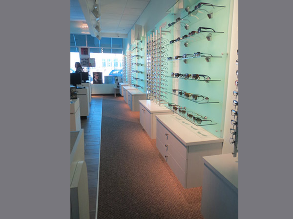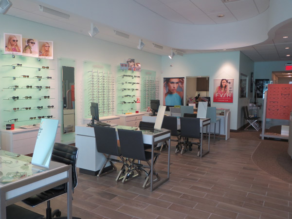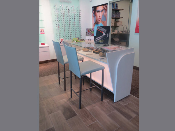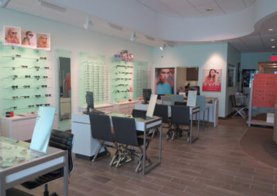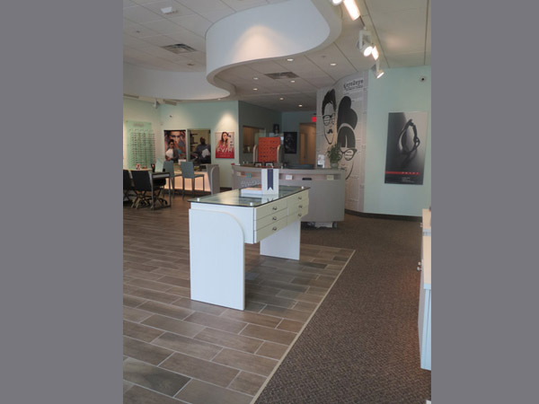 What to do when faced with a partial floor slab on top of a long closed landfil, some metal studs, and a concrete deck with a story above? Mine existing visual references to establish a brand and then go for it. This project won an honorable mention in “INVISION’S 2016 Americaa’s Finest Optical Retailers.”